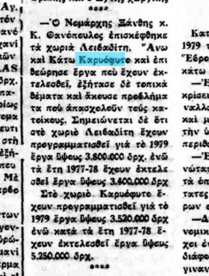 Σύφωνα με το δημοσίευμα, για το έτος 1979 τα έργα που είχαν προγραμματιστεί για το Καρυόφυτο ήταν ύψους 3.520.000 δραχμών ενώ για τα έτη 1977-1978 είχαν εκτελεσθεί έργα ύψους 5.250.000 δραχμών.