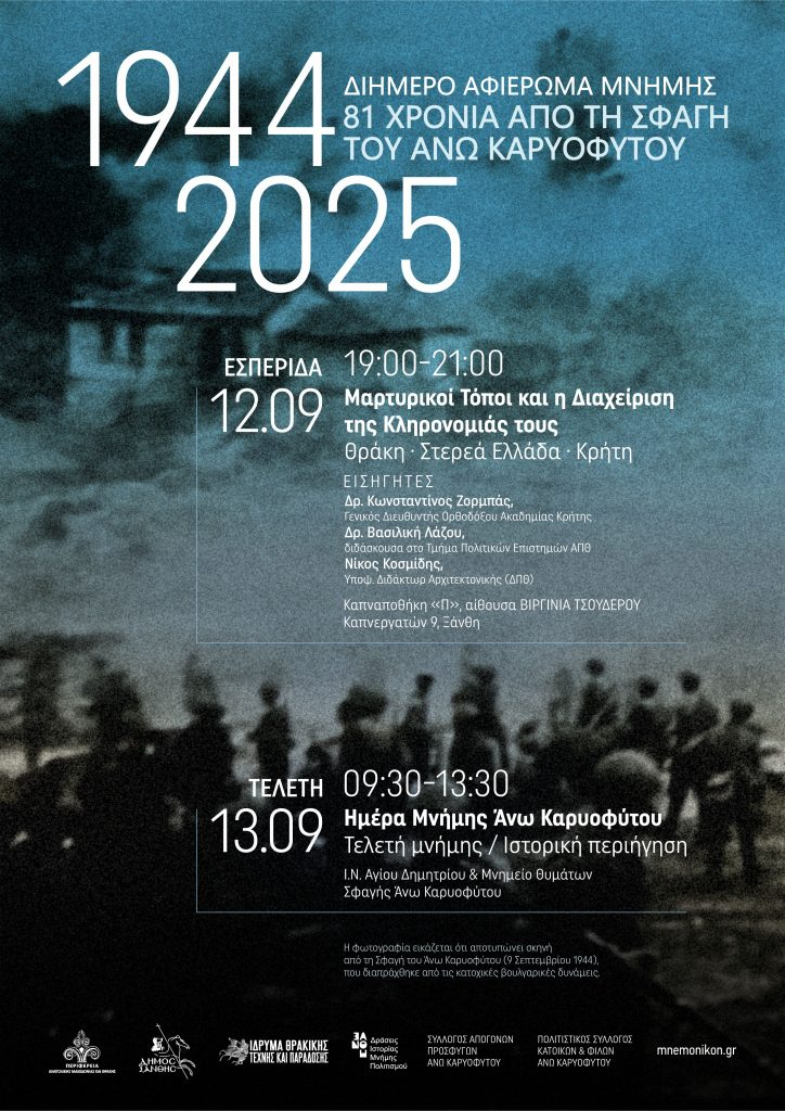 Στις 12–13 Σεπτεμβρίου 2025, η Ξάνθη και το Άνω Καρυόφυτο θα φιλοξενήσουν το διήμερο Αφιέρωμα Μνήμης για τα 81 χρόνια από τη Σφαγή του 1944.