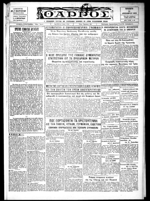 Εφημερίδα ΘΑΡΡΟΣ , Παρασκευή 25 Δεκεμβρίου 1953.