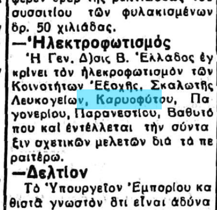 Τον Δεκέμβρη του 1953, φαίνεται να εγκρίνει η Διεύθυνση Βορείου Ελλάδος την ηλεκτροδότηση στο Άνω Καρυόφυτο μαζί με εκείνη του Παρανεστίου και να εντέλλεται τη σχετικές μελέτες. Δημοσίευμα ανήμερα Χριστουγέννων προαναγγέλει πως και το Καρυόφυτο θα ηλεκτροδοτηθεί.