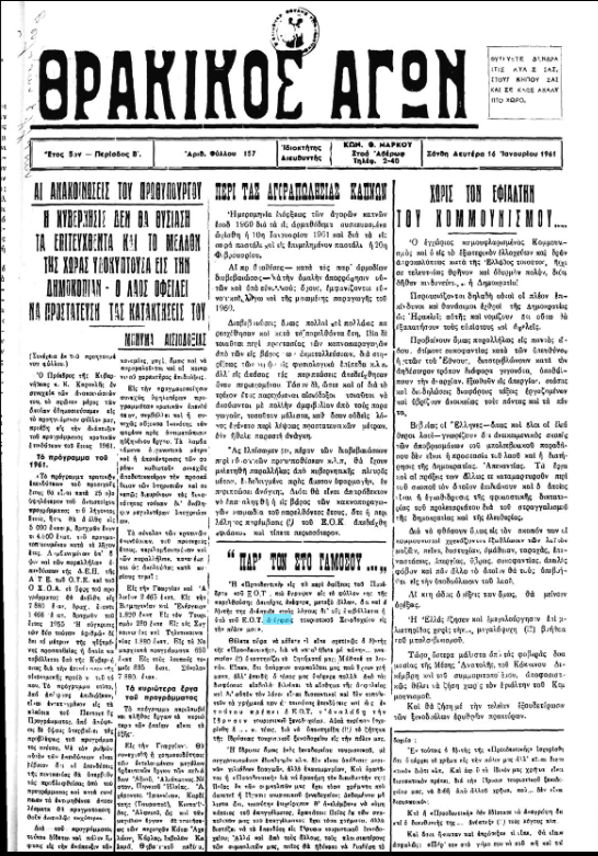 Εφημερίδα ΘΡΑΚΙΚΟΣ ΑΓΩΝ, Δευτέρα 16 Ιανουρίου 1961, Φύλλο 157