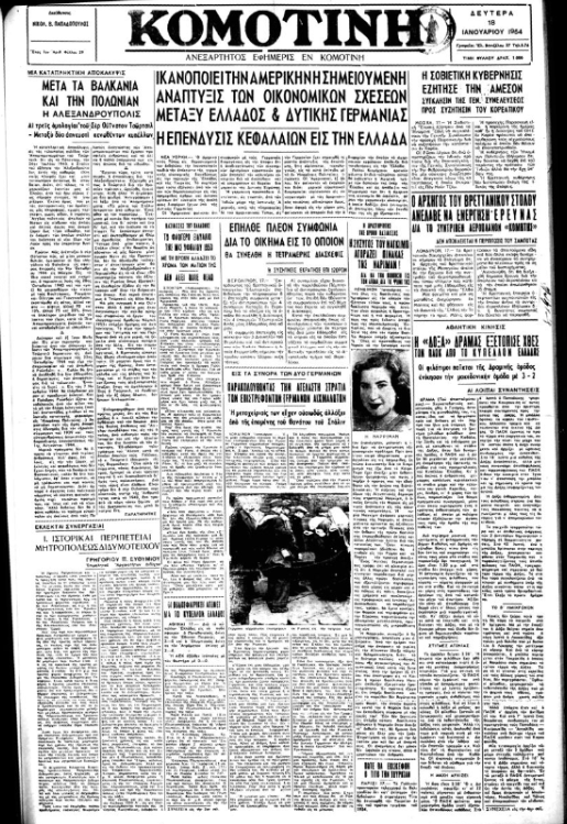 Εφημερίδα ΚΟΜΟΤΗΝΗ, Δευτέρα 18 Ιανουρίου 1954, Φύλλο 29.