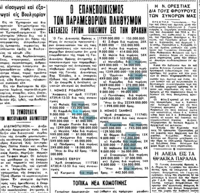 Δημοσίευμα της “ΕΦΗΜΕΡΙΣ ΔΙΑΚΥΡΗΞΕΩΝ” της 9ης Ιουλίου 1950 κάνει λόγο για την προκύρηξη κατασκευής 60 πυρήνων και επισκευή 10 οικιών (που πιθανά είχαν γλυτώσει από το κάψιμο των βουλγάρων σε κάποιο τμήμα τους).