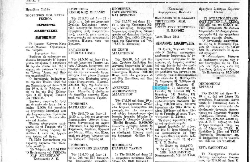 Μαζί με τις πλατείες των κοντινών χωριών, Μαργαρίτη και Δαφνώνος φαίνεται να δημοπρατήθηκε και η πλατεία του χωριού μας, ‘Ανω Καρυοφύτου, το Μάιο του 1970. Ο διαγωνισμός προκυρήχθηκε από τον Διευθυντή Τεχνικών Υπηρεσιών Ξάνθης.