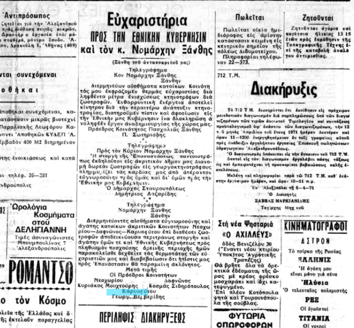 Απ’ ότι δείχνουν τα δημοσιεύματα την περίοδο της χούντας ήταν σύνηθες οι πρόεδροι των Κοινοτήτων να ευχαριστούν με κάθε τρόπο την τότε εξουσία.