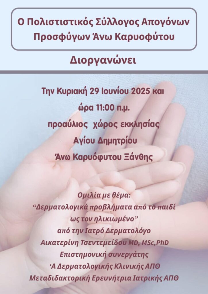 Ο Σύλλογος Απογόνων Προσφύγων Άνω Καρυοφύτου διοργάνωσε την Κυριακή 29 Ιουνίου 2025, στις 11:00 π.μ., ενημερωτική ομιλία με θέμα τις δερματοπάθειες σε όλες τις ηλικίες – από τη νηπιακή έως την τρίτη ηλικία.