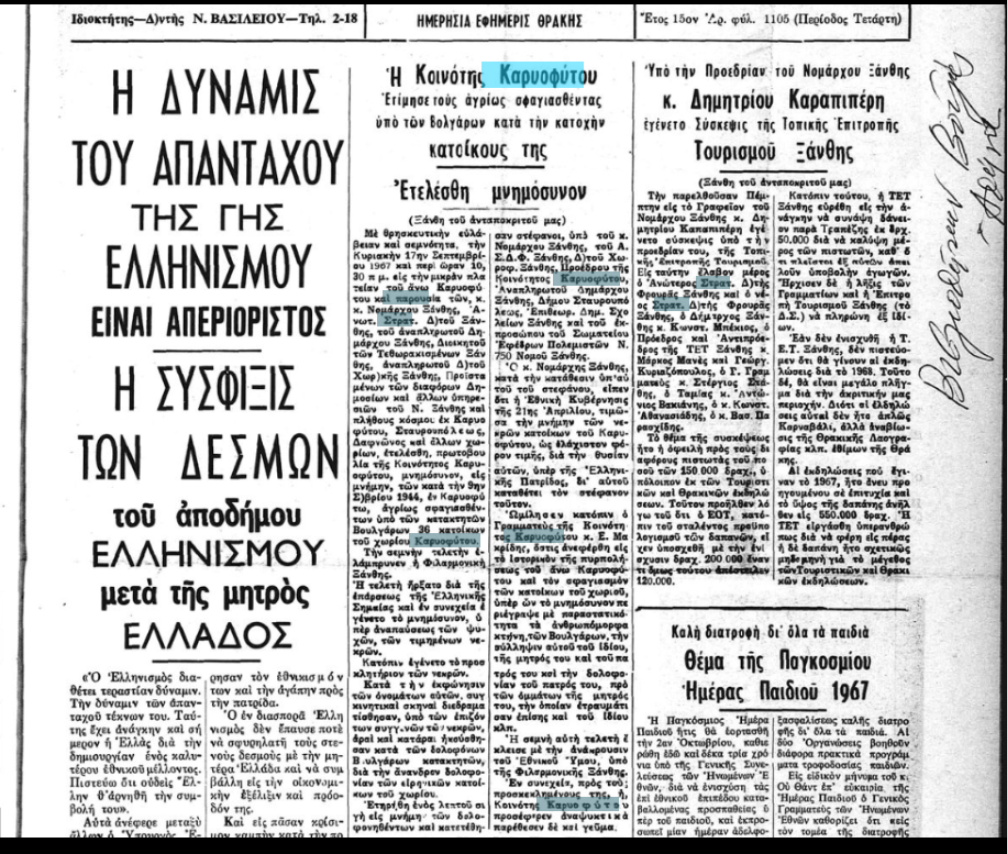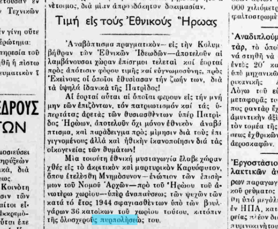 “Μία τοιούτη εθνική μυσταγωγία έλαβε χώραν χθες εις το ακριτικόν και μαρτυρικόν Καρυόφυτον, όπου ετελέσθη Μνημόσυνον-ενώπιον των επισήμων του Νομού Αρχών –προ του Ηρώου του ανωτέρου χωρίου-υπέρ αναπαυσεως των ψυχών των κατά το έτος 1944 σφαγιασθέντων υπό των βουλγάρων 36 κατοίκων του χωρίου τούτου, κατόπιν της ολοσχερούς πυρπολήσεώς του.